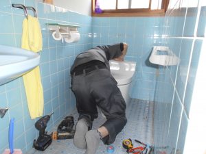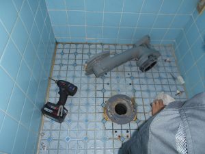 床がタイルでしたので、ハンマードリルで本体取付用の下穴を開けて既設のフランジに排水配管セットを取り付けます。