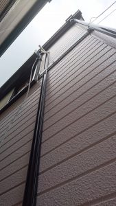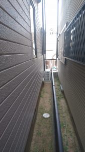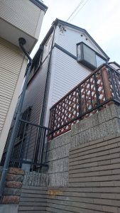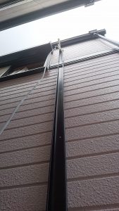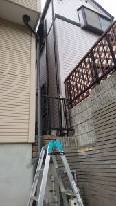 長バシゴが立つスペースはもちろん無く、2階の窓からの作業となりました。窓に足をかけ、身を乗り出さなければ手が届きませんでした。安全ベルトを腰にしっかり巻き、ベルトのロープをしっかりとひっぱってもらいながら、安全第一で作業しました。1階部分ははしごを垂直に近いかたちで立てかけ、隣の家の方に了解を得た上で、壁に体を預けながらの作業でした。