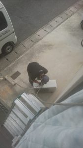 室外機の入れ替えも通り道に給湯器や配水管等あり普通に持ち運ぶことが出来ません。上記写真の真ん中ですが、脚立を下に立て、ローブで室外機をしっかりくくり、吊り下げながら入れ替えを行いました。