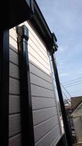 長バシゴが立つスペースはもちろん無く、2階の窓からの作業となりました。窓に足をかけ、身を乗り出さなければ手が届きませんでした。安全ベルトを腰にしっかり巻き、ベルトのロープをしっかりとひっぱってもらいながら、安全第一で作業しました。1階部分ははしごを垂直に近いかたちで立てかけ、隣の家の方に了解を得た上で、壁に体を預けながらの作業でした。