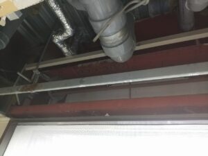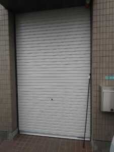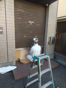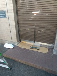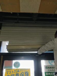 2日目はシャッターの取替となります。シャッター職人に給排水管の位置などを確認してもらい工事の段取りをしてもらいます。排水管が邪魔をするので一気に取替とはいかずシャッターのスラットを少しずつ巻き取っていく工法に決めて取替えのスタートです。