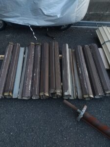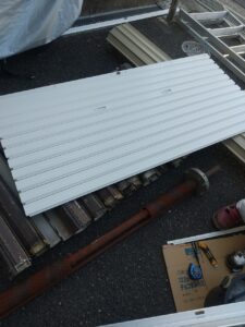 既設のシャッターの撤去から始めます。シャッターの縦方向の真ん中をサンダーでカットしスラットを順番に下からガイドレールから引き抜いていきます。