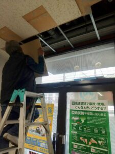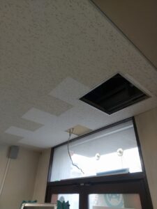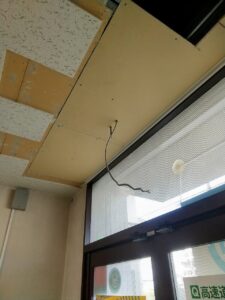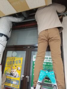 スタッフ1号です。今回ご紹介するのは新年早々に行った某事務所様のシャッターの取替工事です。経年によりシャッターの上げ下げが重たくなり軽量シャッターへの取替えを昨年末にご依頼いただき、年明けに工事をさせてたいただきました。まずはシャッターを取り替える為には、天井を開口する必要があります。