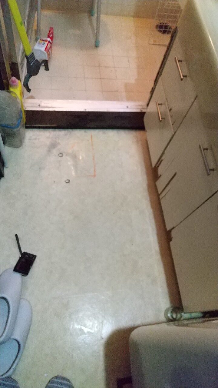 脱衣場側の出入口床です。わかりにくいですが凹んでいます。落ちないように応急的にコンパネを敷いておきました。
