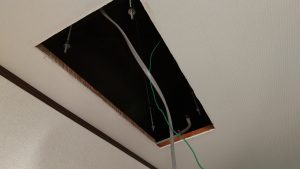 既設エアコン、新設エアコンともD社製で吊り下げ金具の位置は同じでしたので、そのままビルトイン。 配管、配線を繋ぎ、ドレン管も繋ぎ終え断熱材も巻き終わり、あとはグリルパネルを取付したら室内機の工事は完了です。