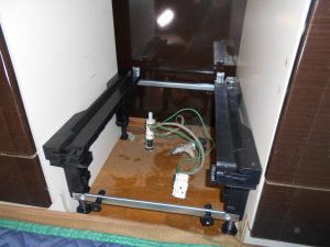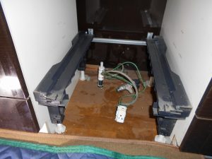 新しい台枠を取付し脚部とサイドのキャビネットにビスで固定。本体を取り付ける準備をします。