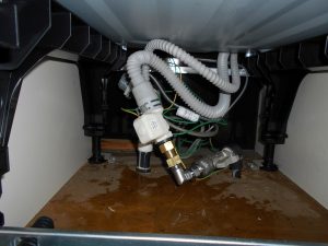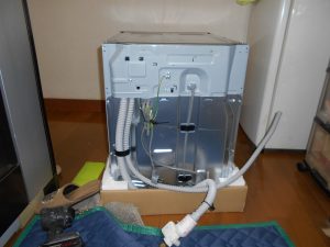 本体を仮置きして高さと前面の調整をしてから給排水と電源を繋ぎ込みし、漏水の確認をしてから床を掃除して、