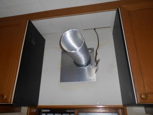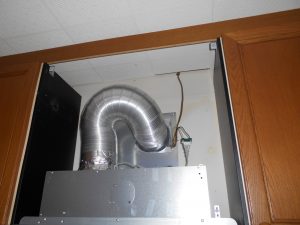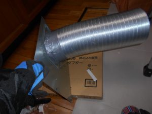最後にダクトを繋ぎ込み、前幕板を取り付けて取り換え完了です。今回のレンジフードは、油トルネード機能付きの商品です。運転終了前にファンを高速回転させ、羽に付いた油汚れを遠心力で吹き飛ばす為、羽のお手入れは3年に1度でOK!!お掃除ラクラクとなります。