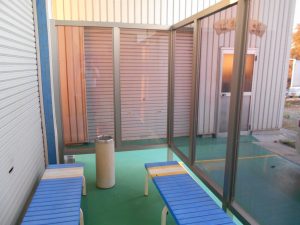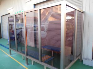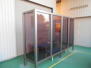 以前はこの場所に簡易で、社員様がオフィスパーティションを組み合わせて喫煙ブースを設けておりましたがこの秋の台風で倒れてしまい、このたび弊社でしっかりと固定した喫煙ブースを作らせて頂きました。