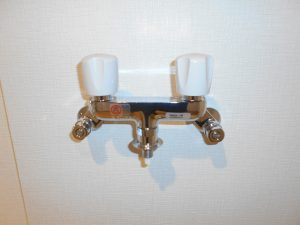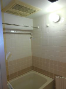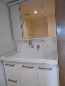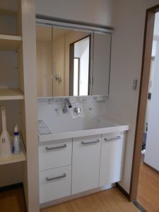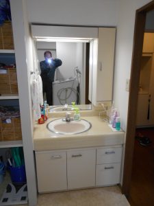 洗面台ですが、こちらもこの団地用にあしらえた商品と思われ、写真で分かり難いのですが、ミラーユニットの上には梁が通っておりユニットの高さがフロアから1780ミリしかありません。さらに洗い場の高さもかなり低い状態の商品が付いており、昔、施主様が他の業者に相談したところ収まる商品が無いと断られたそうです。私もパラパラと手持ちのカタログを確認しましたが、すぐに合う商品があるのか見つける事が出来ませんでした。