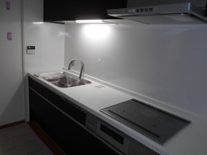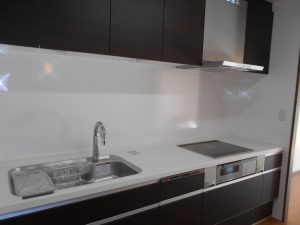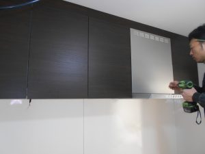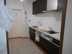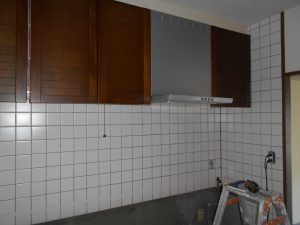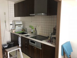 キッチン組みです。既設のレンジフードとIHクッキングヒーターは取り替えて間がないので再利用します。
