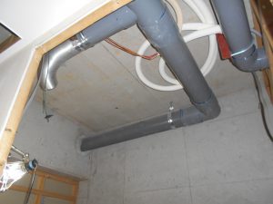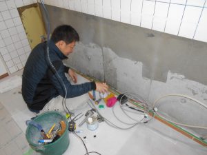 既設キッチン撤去後、今回新しく納めるキツチンに合わせ、先行して給排水配管の仕込みと電源仕込みの工事の様子です。