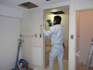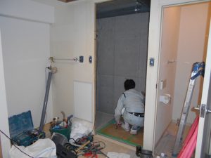 スタッフ1号です。今回の記事は1月末より施工いたしました団地の水回り工事をアップします。今回の工事をさせて頂くにあたり、昨年に弊社のお客様宅の上階より水漏れが発生しほぼ全部屋に被害があり、壁・天井・床の全面改修と電気関連器具の取替などのベースになる工事を上階のお知り合いの工務店様が請け負い、水回りの工事はお客様が自費でキッチン・バス・洗面の入れ替え工事をされる事になり、その水回り工事を弊社にと、ご依頼下さいました。ベースを請け負っている工務店様とも密に連絡を取りながら、お互いに気持ちよく仕事ができたと思っています。では、工事の様子をアップします。