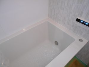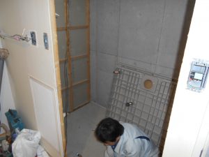 今までの浴室は、脱衣場床より床が60ミリ程度下がっていましたが、今回は脱衣場床と浴室床の段差を0にします。