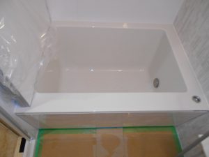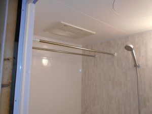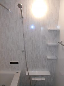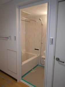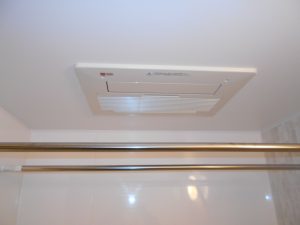 パナソニックのマンションリフォーム用バスMRシリーズです。今回のプランはお客様のご希望でミラーは無しのプランです。浴槽は断熱保温浴槽です。脱衣場と浴室の段差は写真の通り0で仕上げています。温水暖房換気乾燥機はバス天井を現場加工での取付です。