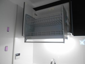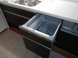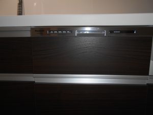 パナソニックのラクシーナシリーズです。卓上用の食洗機からビルトイン食洗器に代わりました。キッチンの水栓は手をかざしたりお皿を持っていくと自動で水が流れるオート水栓を取付けしました。吊り戸の一部はソフトダウン収納にしました。