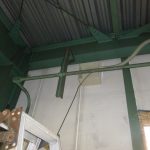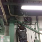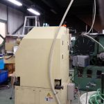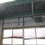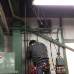 2台の機械が所定の位置に設置されましたので機械への配線をつなぎます。配線はこのような工場の場合は足元に物を置いたり、つまずかない様に天井から下ろすケースが多いです。