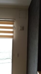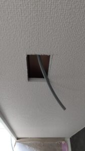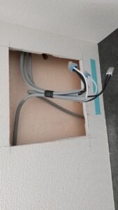 壁を1ヶ所開口しレンジフードの電源から分岐した配線とスイッチに行く配線と照明に送る配線をここで結線します。開口部の壁は弊社で補修して工務店様の内装屋さんが後でクロスを貼ります。