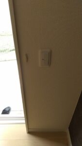 逆光で分かりにくいですが開口した壁を補修しています(左)    新しく設けた照明器具用のスイッチです。(右)