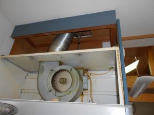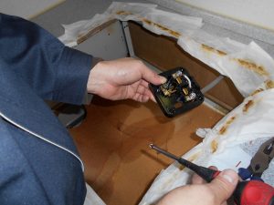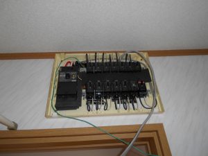 さらに、レンジフードの幕板を外し配線をガスコック付近まで壁の裏を通します。そして分電盤の中にも配線を天井裏から下ろしてきています。