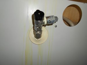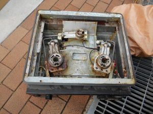 まずは、既存のガスコンロを撤去し、ガスコックの2次側にプラグをつけて、ガスコックを間違って開いてもガス漏れをさせない様にします。この作業も資格が要ります。