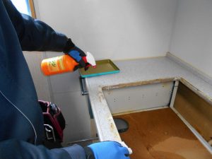 電気工事が完了したところで、IHの取り付け前に最後に周囲を綺麗にしていきます。弊社ではオレンジクリーナーは必須アイテムです。
