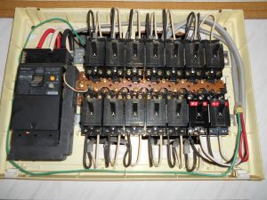 IH専用のコンセントに配線を繋ぎます。まわりのキッチンペーパーは洗剤を浸してガスコンロを外した後の油汚れを取るためのものです。  時間を有効にする為コンロを外した後、すぐにこの作業はしています。右は分電盤に新しく200Ⅴ30Aのブレーカーを取り付け繋ぎこみ分電盤に今まで無かったアース線も配線しています。30Aでは配線は2.6ミリのVA線か5.5sqのSV線を使用する場合が普通ですが、弊社は早くから同じ許容量でも細いタフラインの2.0ミリを使用しています。