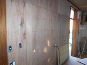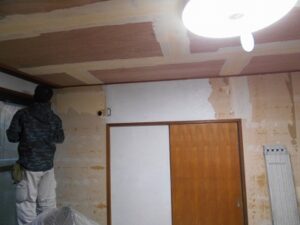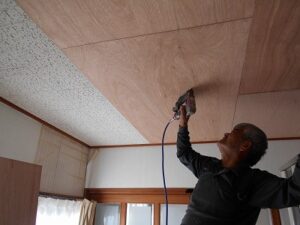 3・4日目は、大工工事となります。キッチンの不要な垂れ壁を撤去し、下地の造作をします。その後、天井・壁の捨て貼りを行いました。