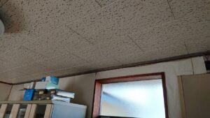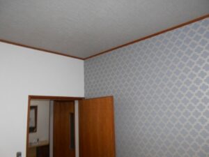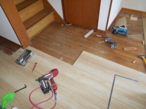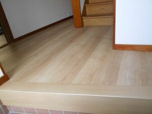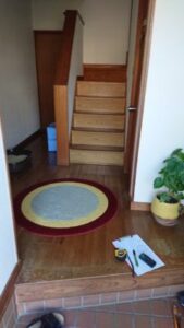 5・6日目は、大工工事及び内装工事です。大工工事は、玄関のフローリングと玄関框の増貼りです。巾木が壁に吞み込んでいる為、フローリングを削り合わせての施工となりました。内装工事は、キッチンとリビングの天井及び壁のクロス張替えです。既設リビングの壁紙が塗装してあった為、クロスをめくるのに一苦労でした。その後パテうちをしてクロス貼となります。