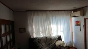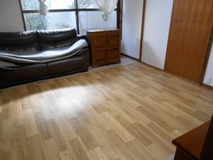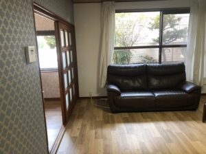 改装前のキッチン・リビング・玄関です。今回の工事で、リビングとキッチンでは、システムキッチン入替・天井壁のクロス貼替・床のCF貼・分電盤取替・配線隠蔽・ガスコンセント増設等の工事となりました。玄関はフローリング・玄関框の増貼り工事を行いました。工期は9日間となりました。