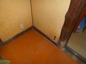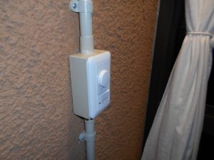 テラス側です。配線を貫通したところにボックスを設けてコンセントを新設。そこからさらに照明用の電源を電線管を使用して配線しました。右の写真は調光ライトコントローラスイッチです。明るさをツマミを回して調整します。
