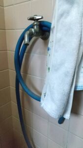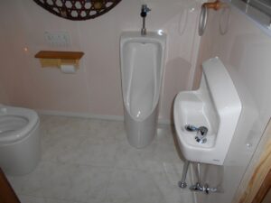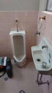 大便器、小便器、手洗い器のすべてを新しく交換します。右の写真の給水栓は今回は撤去します。