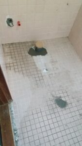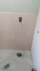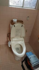 今回のご依頼はトイレ改修工事です。水回り設備を全部新しく取替し出入口段差の解消、床材の変更、腰壁面タイルからパネルに変更、更にドアの取替の工事です。まずは改修前の状況から