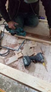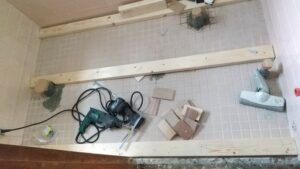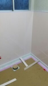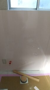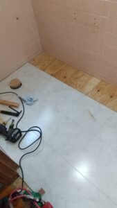 床工事です。タイル床で水洗いが出来る構造ですから当然床は不陸(各方向水平でないこと)ですから調整は大変ですし、床鳴りに細心の注意をし仕上げていきます。仕上げの床材はアンモニアや水に強いサニタリー用の床材です。