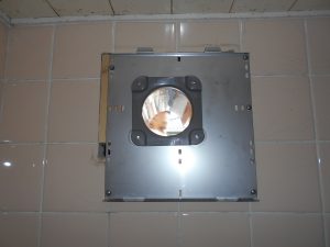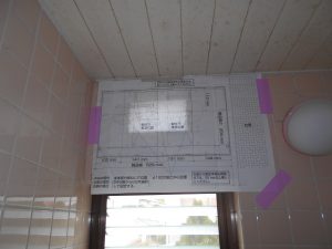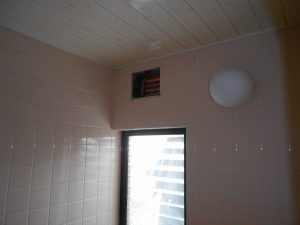 今回の浴室は在来工法で既設の換気ガラリを撤去し、その開口部を利用しての工事となります。                  事前に工務店様からの写真を見てタイルの枚数から取付が可能かどうかを現場に行かず判断しました。          上の写真は施工開始後で浴室内のガラリを撤去したあとで撮りました。