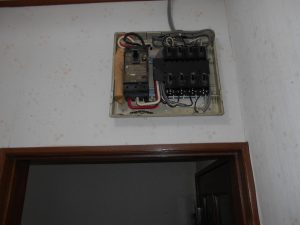 室内側の脱衣場にある分電盤にバスカン専用200Vのブレーカーを取付します。(写真は取付前)分電盤に追加ブレーカーのスペースがないため分電盤の外へ取付しました。