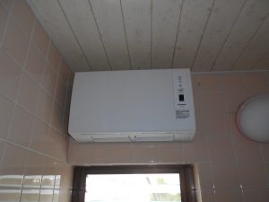 バスカンの本体を取付。エアコンの室内機を取り付ける要領と同じです。上下左右ともメーカー指定寸法のクリアランスは取れています。