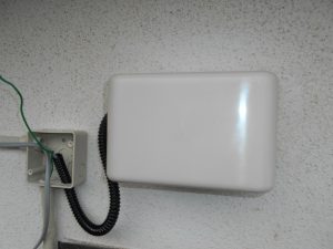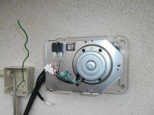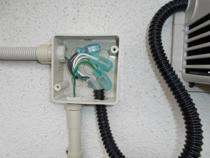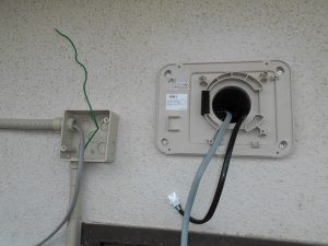 外部です。本体からダクトを通して電源線と換気扇へのコネクター付き送り配線が出ています。            写真の左側は電源工事の様子です。アースがどこにもなく分岐できませんでしたので、打ち込みアース棒を地中に打ち込みアース線を電源を接続するボックスまで立ち上げています。ボックスの左から入っているのが電源線です。     こちらのバスカンは200Vの専用回路となります。ですからアースは必須です。