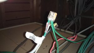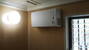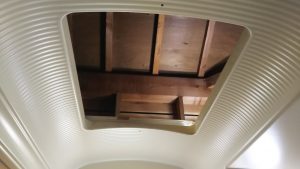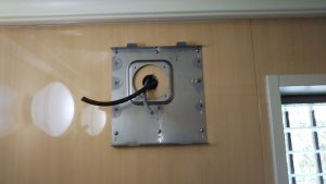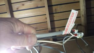 撤去時に本体から天井裏に送っている配線を2本切って壁から20センチほど残します。その配線に新しい機械の配線をビニールテープで巻きつけて下の写真の点検口をあけて残った配線を引っ張ると新しい機械の配線もスムーズに天井裏に引っ張りあがってきます。