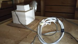 上の白い物体が既設換気扇です。バスカン電源線を配線後の写真です。