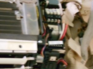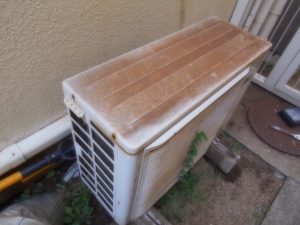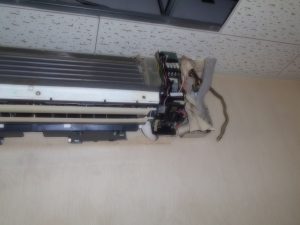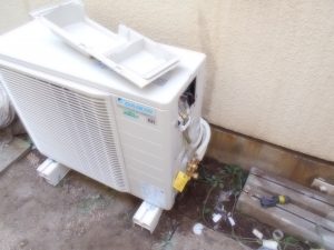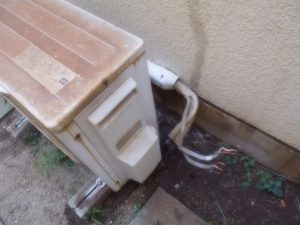 室外機からばらします。ポンプダウンしてガスを室外機側に回収し終えたら、一時側の動力ブレーカーを落とします。電源線、渡り線をばらして室外機を撤去。