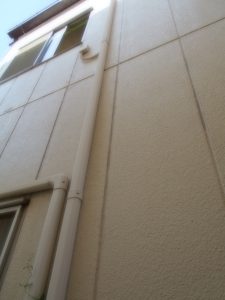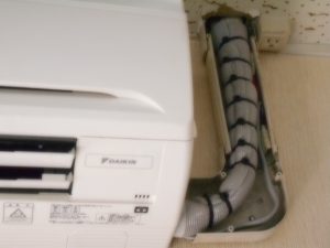 ドレン管を既設のビニル管に差し込みパテで固定しています。