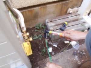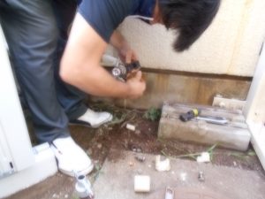 配管を室外機に繋ぎ、電源線と渡り線を繋いだあと、今まで取れていなかった接地をアース棒を打ち込み機器とつなぎます。
