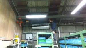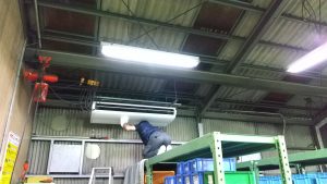 まずは神戸工場ですが、5馬力の天吊り型の移設工事です。中2階の倉庫から撤去し1階の商品管理部に取付です。