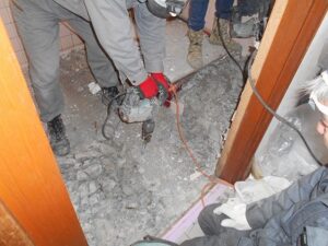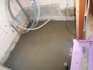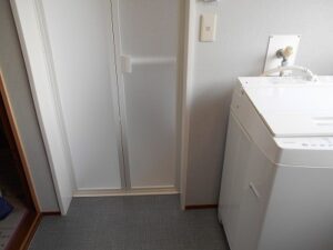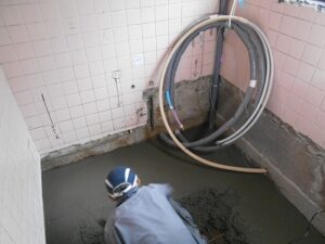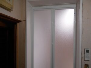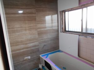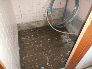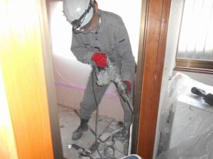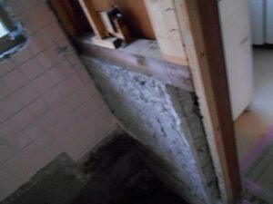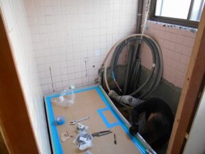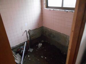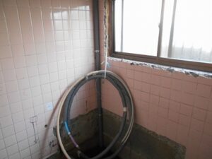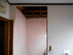 既設の出入り口横の柱も横に移動させ、解体完了です。今回はシステムバス据付必要寸法がとれてましたので、壁の3面はタイルを残したままでもOKでした。