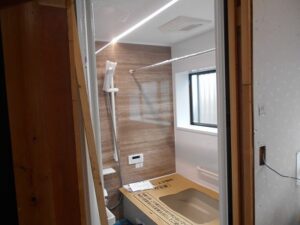 5日目 システムバスの出入り口廻りを、枠仕舞いして、横の控え壁を新たに造作しました。