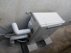 システムバスの入替と同時にガス給湯器の取替です。ボイラーからの取替の為、給湯器設置場所までガス配管を分岐延長し、給水・給湯・追い炊き配管を繋ぎ込み取替完了です。