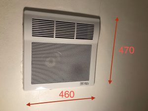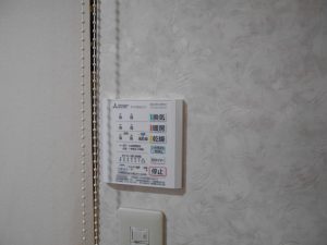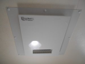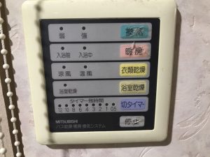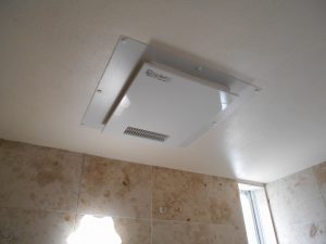 三菱製のヒータータイプの暖房換気乾燥機です。この商品本来はシステムバス用なのですが在来浴室の天井にビルトインされていました。今回の工事では既設商品を撤去し同じ位置に新しい商品を取付します。