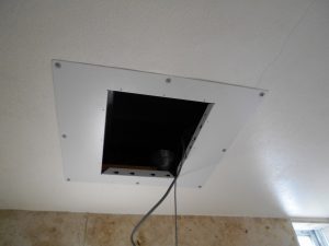 新しい商品は、撤去商品のサイズより小さくなりますので別売のパネルを撤去後の開口部分に取付をしています。垂れ下がっている配線は電源線とリモコン線です。リモコン線はすでに入れ替えしています。