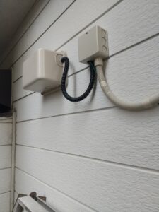 今回の浴乾は、換気扇付仕様ですので左の写真のように、外部の出っ張りには換気扇が装着されています。以上で今回の浴乾工事はすべて完了です。着工から竣工までちょうど2時間でした。これで施主様には安心して冬場のお風呂に入っていただけます。施主様、元請けのS様ありがとうごさいました。